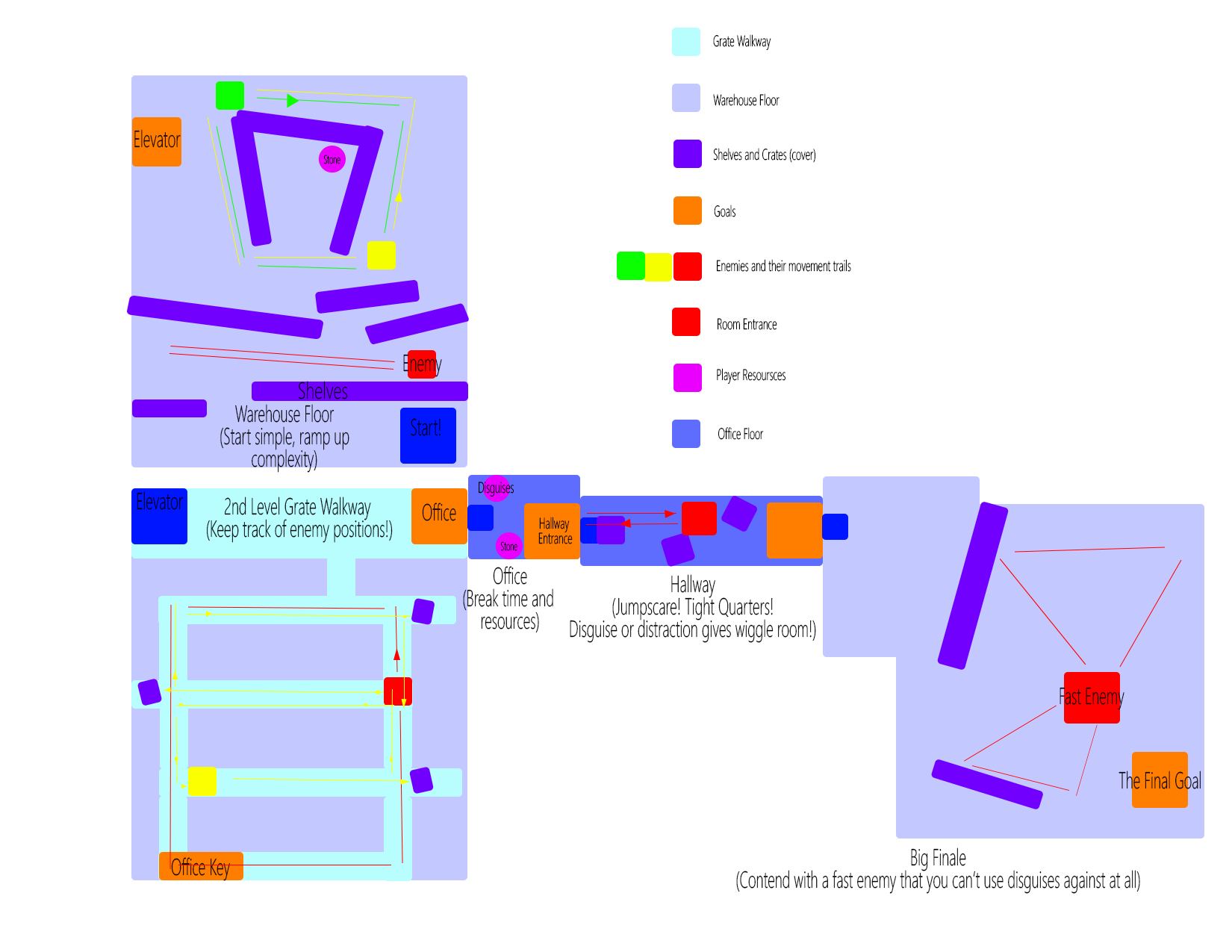 Player Advantages: The player's ability to dash, hide, learn patrol routes and throw items are very important to the warehouse. Especially observing patrol routes lets the player take multiple methods and routes throughout the rooms while making existing routes via just hiding behind cover much easier. The final area and walkways were directly built so that the player could observe the enemy's patrol paths before taking them on.