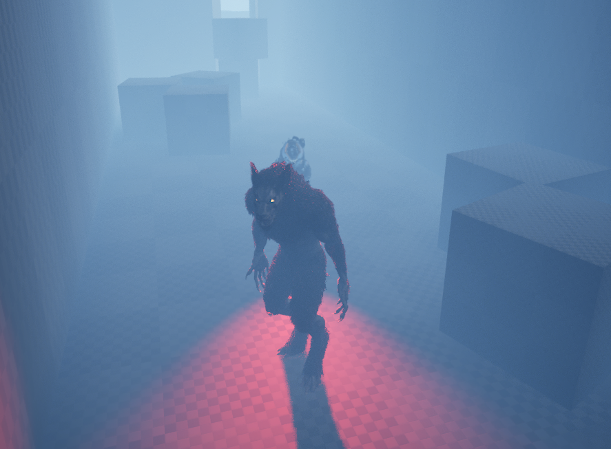 The player is pretty simple. In fact, they can’t even jump, the binding of which was removed due to not providing much to the layout itself other than confusing the player about the fact that they weren’t intended to be able to get on top of the cover. If more verticality (such as the option to run along the top of the shelves of floor 1, something that I have considered) is added at some point in the future, the ability to jump will most likely come back along with it. Other than the dash, crouch and the fact that the camera had to be moved backwards and up due to the werewolf’s massive frame, there isn’t a huge amount to discuss in regard to their mechanics.